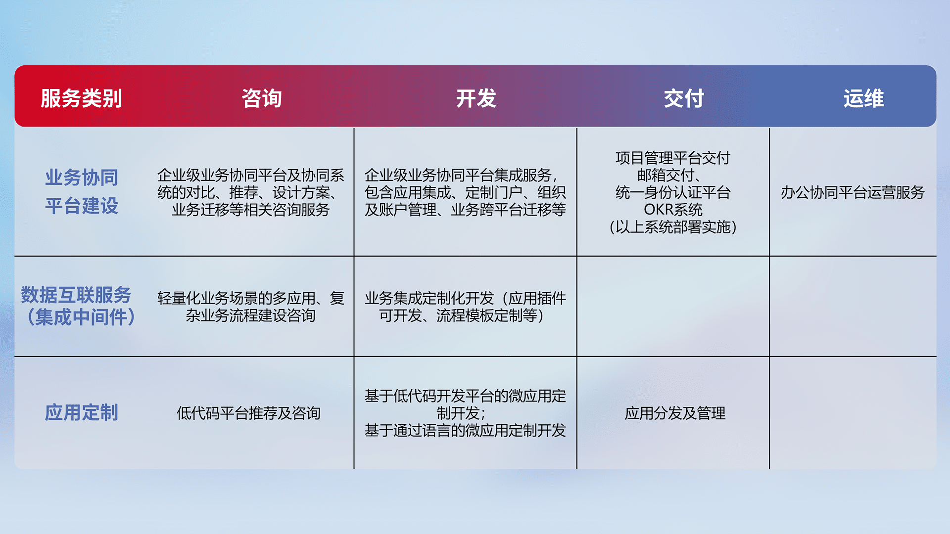 针对钉钉、、企微、、、、IDaas等平台级产品提供产品的规划、、方案、、交付、、、定制化开发等服务,,实现如统一协同办公、、、智能客户服务、、混合会议管理、、、、智能数据查询、、等业务场景,,实现数字化转型。。。